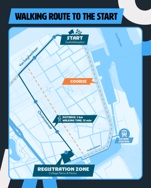 - The train station in the centre of Ostend is a 200m walk from the College Petrus & Paulus (registration area) and an 850m walk from Zeeheldenplein (start & finish).