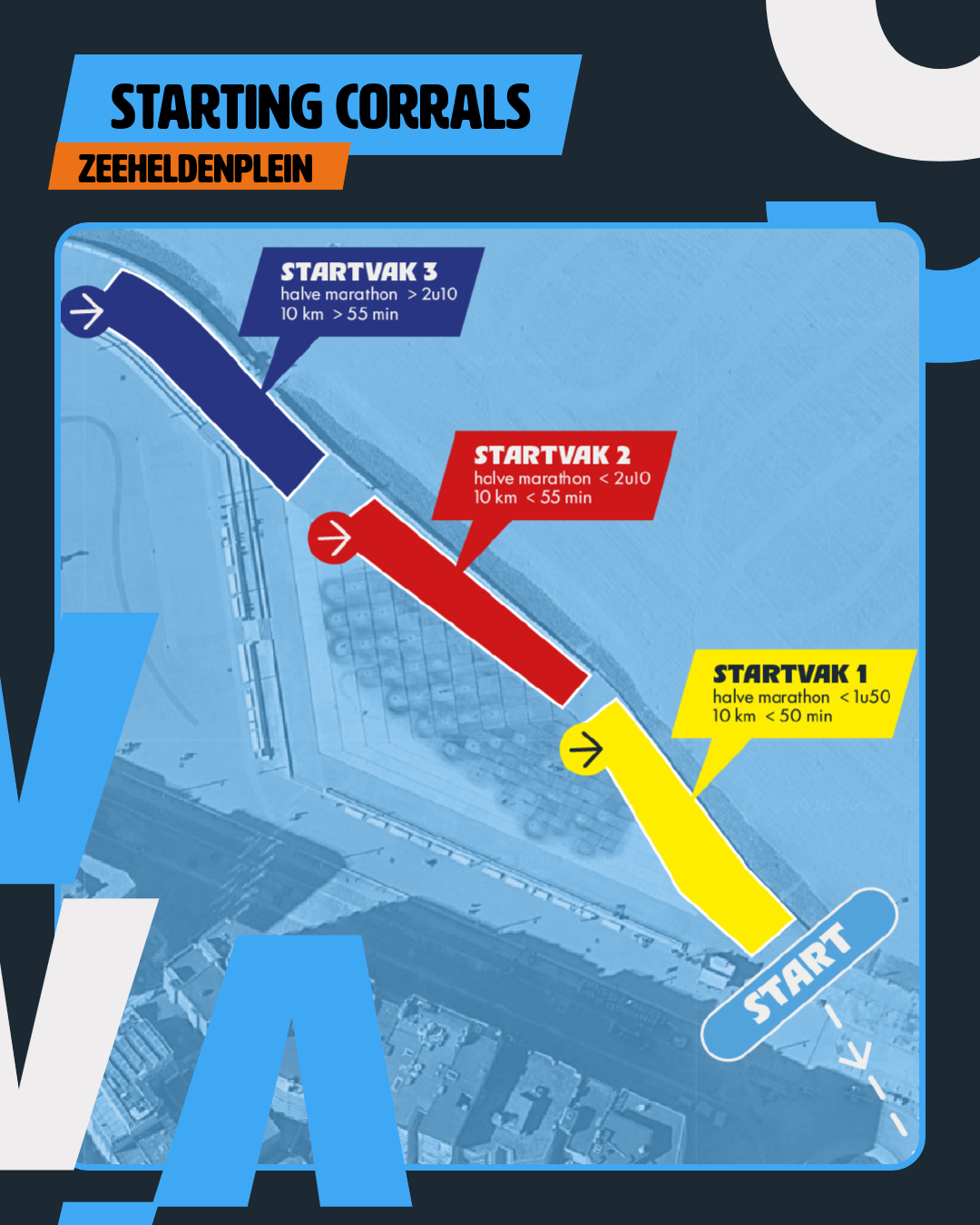 The 10 km starts at 9:45 a.m., the half marathon at 10:30 a.m. Both distances start from Zeeheldenplein. Please note this is 1 km from the registration area, changing rooms and bag drop area.